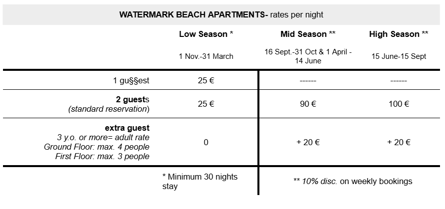 Important: we have a 3 nights minimum stay policy on the Watermark Beach Apartments. Please consider it when setting the check-in/out dates